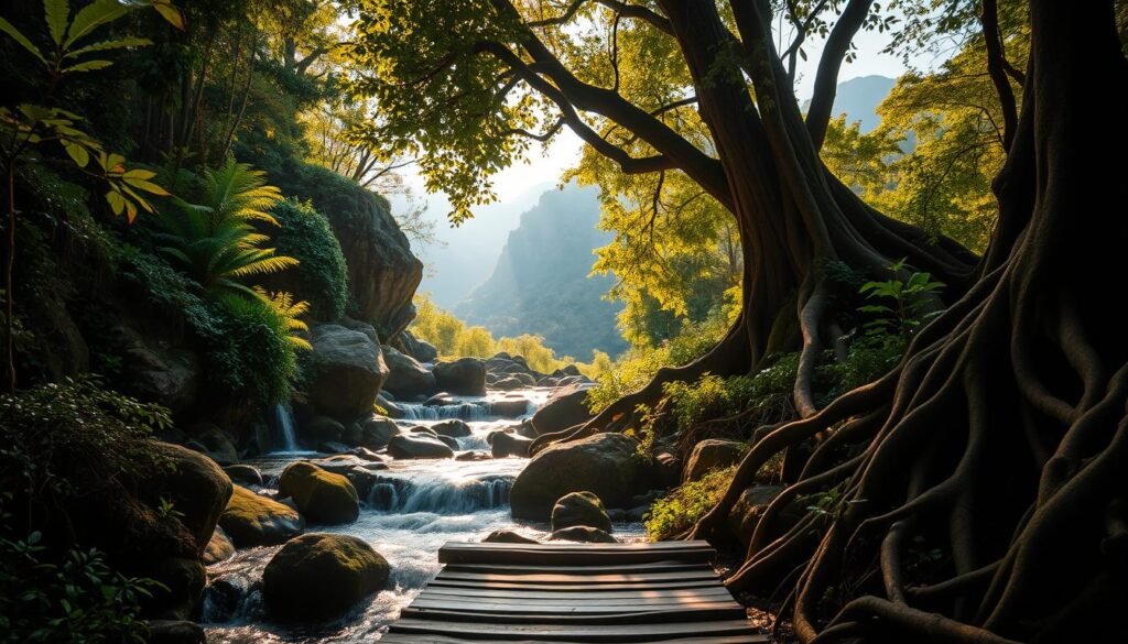 As you start your journey, you’ll see ancient trees and exotic wildlife. It’s great for photography and wildlife watching. The trail is not well-known, making it perfect for finding peace and escaping city life. With good travel tips, you’ll easily find your way and discover its secrets.
